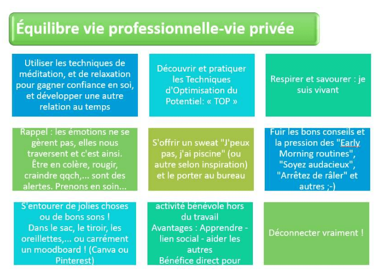De belles idées pour entamer une discussion, car si nous avions été en formation nous aurions pu débattre des idées lors du debrief, discuter des idées, et d’autres seraient sans doute venues se rajouter. Nous aurions aussi échangé sur comment c’est passé pour chacun ce partage, et là nous aurions sans doute eu des personnes qui se seraient exprimées sur certains blocages, certaines prises de conscience, certains apprentissages qu’elles auraient fait.