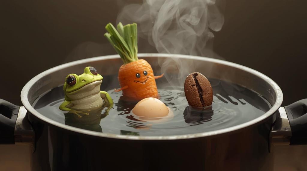 Dans cette histoire souvent racontée, imaginez une grenouille plongée dans une marmite d’eau froide. La température monte très lentement. La grenouille, d’abord à l’aise, s’adapte petit à petit à la chaleur.